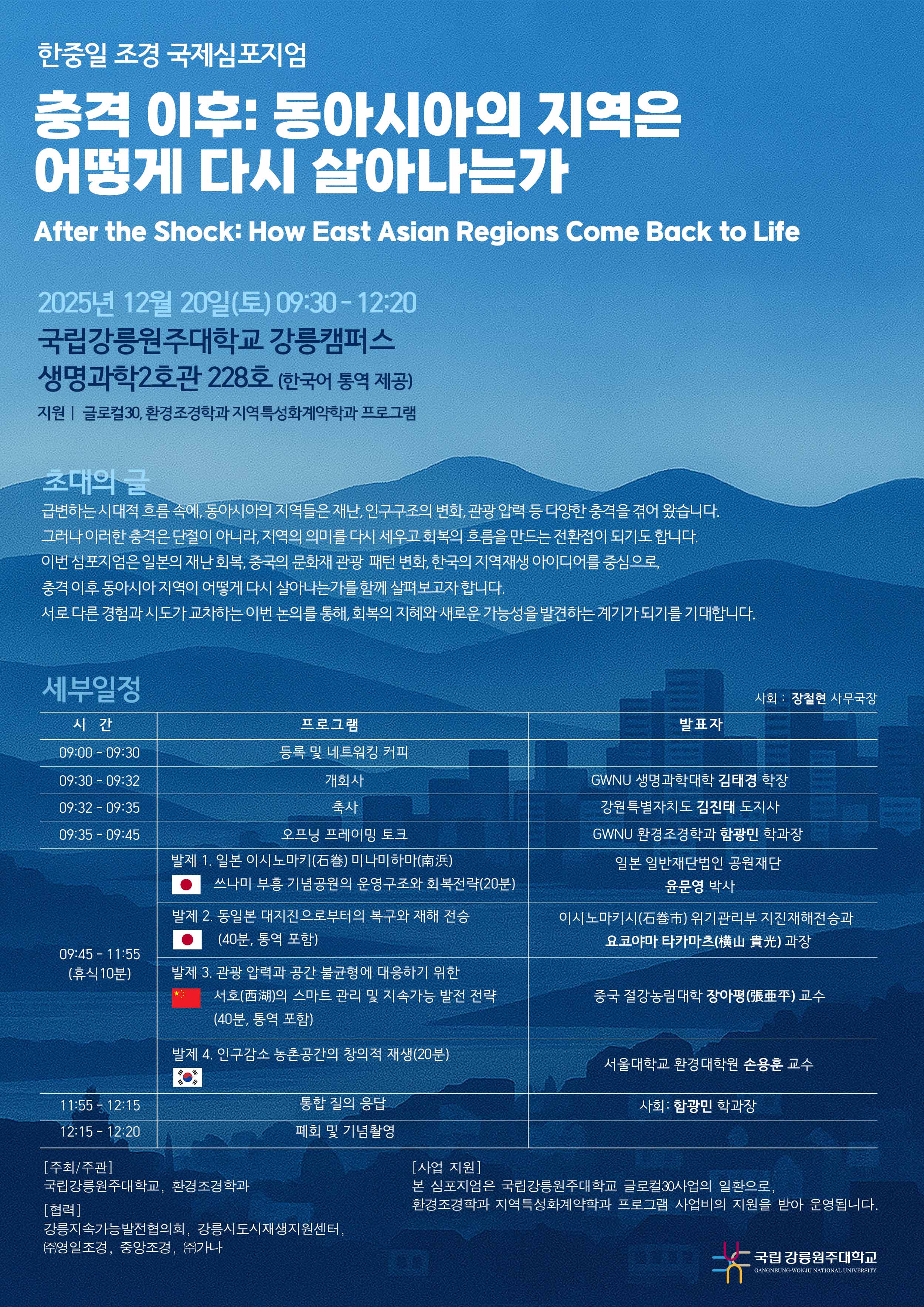 국립강릉원주대학교 환경조경학과에서는 2025년 12월 20일(토) 강릉캠퍼스 생명과학2호관 228호에서 동아시아 지역의 회복과 재생을 주제로 한 국제심포지움을 개최합니다.
