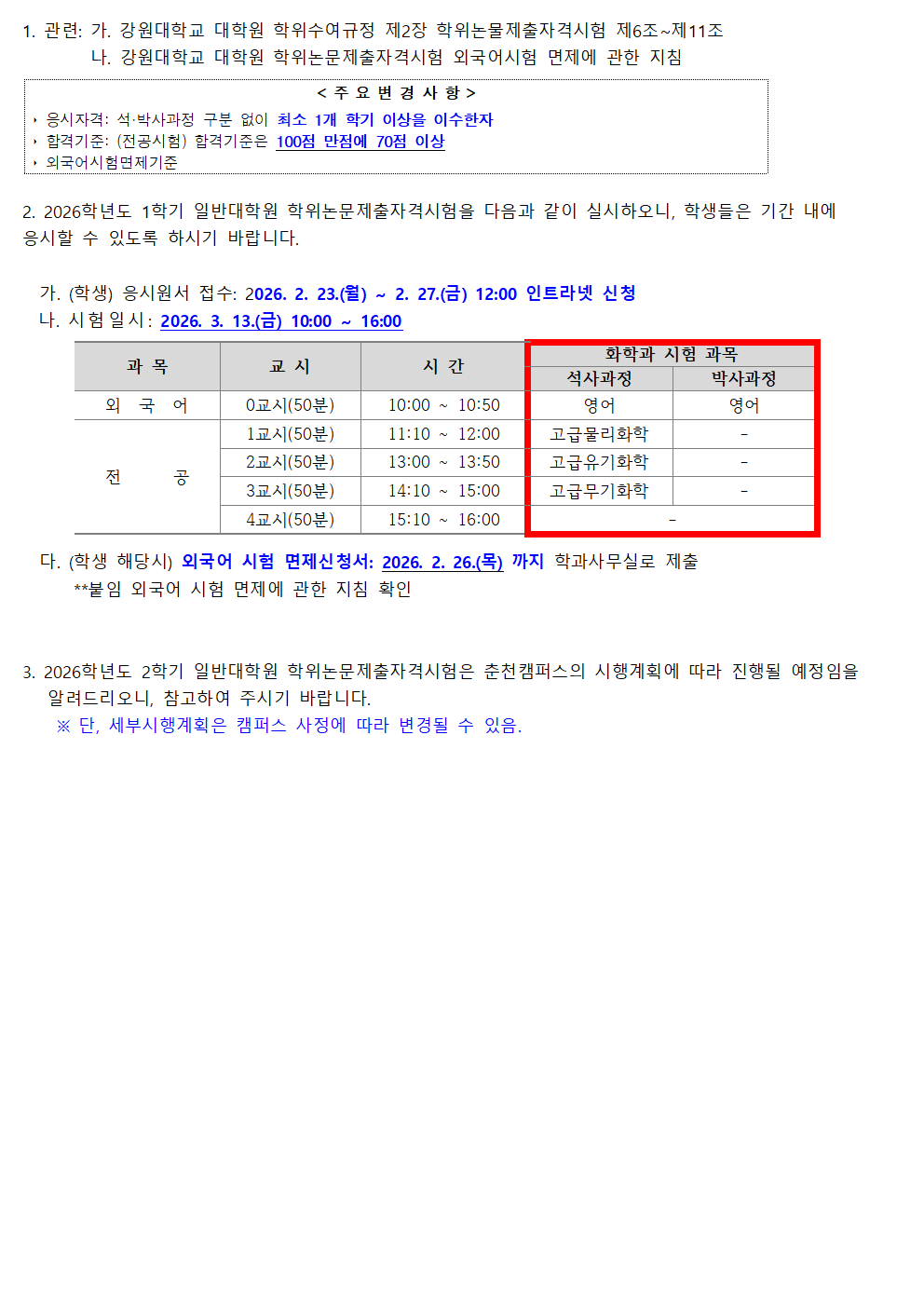 fnctId=bbs,fnctNo=562 [대학원] 2026학년도 1학기 일반대학원 학위논문제출자격시험 실시 안내 작성일 2026.02.19 작성자 진미영 조회수 214 첨부파일 논문제출자격시험 신청 매뉴얼(학생용).pdf 2026학년도 1학기 일반대학원 논문제출자격시험 시행 계획.hwp 강원대학교 대학원 학위논문제출자격시험 외국어시험 면제에 관한 지침(공지용).hwp 각종서식(외국어시험 면제신청서).hwp