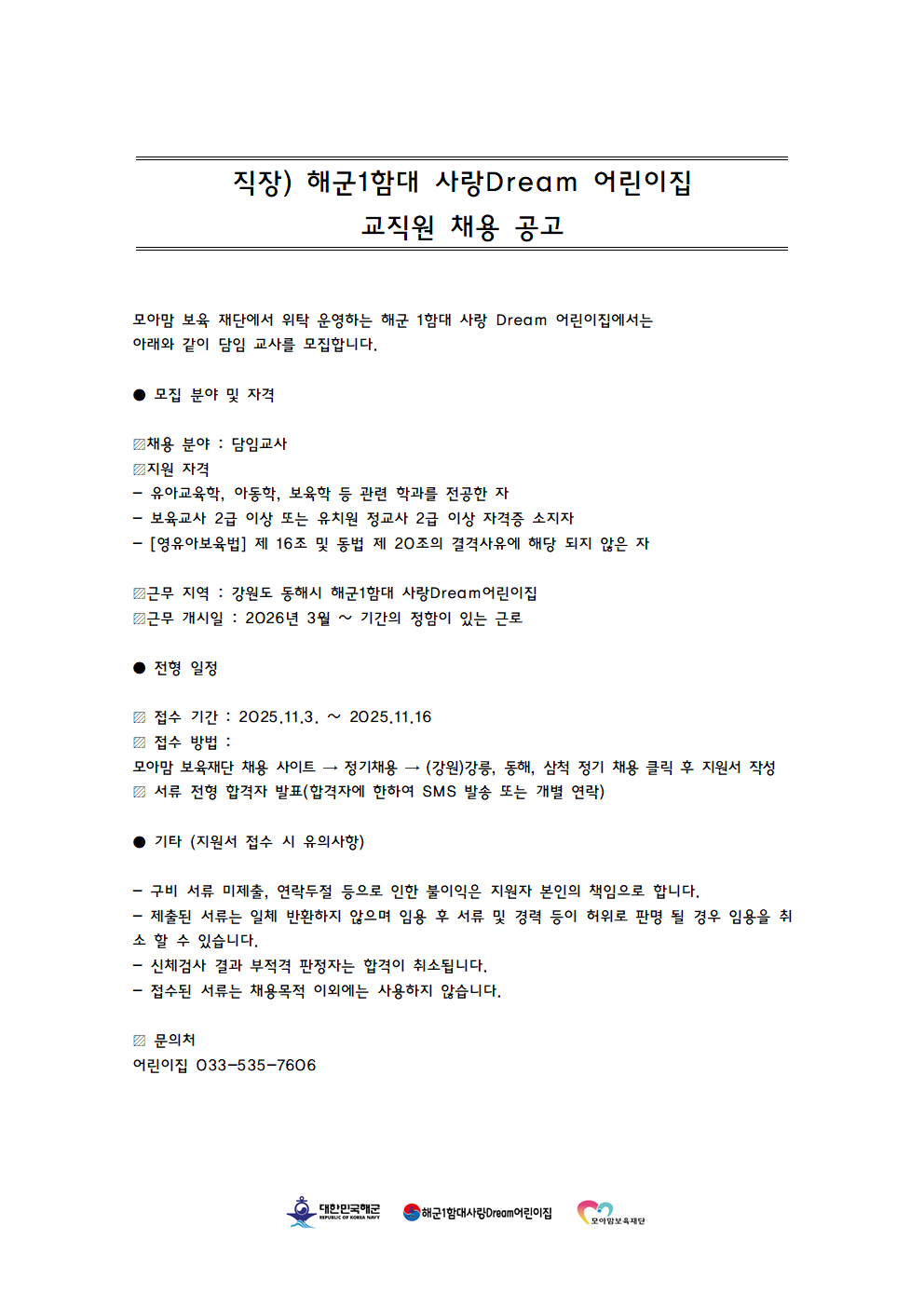 fnctId=bbs,fnctNo=208 해군1함대 사랑Dream 어린이집 교직원 채용 작성일 2025.11.10 작성자 신시원 조회수 537 첨부파일 첨부파일이(가) 없습니다. 다음글 강릉원주대학교 해람어린이집 보육교직원 모집 공고 신시원 2025-11-17 14:27:43.0 이전글 2025학년도 봉대초등학교병설유치원 하계 방학 중 방과후과정 인력 채용 공고 신시원 2025-06-20 09:24:39.0 총 16 개의 게시물이 있습니다. 게시물 검색 제목 작성자 게시글 리스트 취업정보 번호 제목 작성자 작성일 댓글 조회수 첨부파일 16 강원특별자치도자연학습원 직원 공개 채용 신시원 2026.01.12 0 320 1 15 강릉원주대학교 해람어린이집 보육교직원 모집 공고 신시원 2025.11.17 0 757 1 14 해군1함대 사랑Dream 어린이집 교직원 채용 신시원 2025.11.10 0 537 0 13 2025학년도 봉대초등학교병설유치원 하계 방학 중 방과후과정 인력 채용 공고 신시원 2025.06.20 0 2087 0 12 하이원 정선 어린이집(강원랜드 직장어린이집(한솔보육재단)) 보육교사 채용 공고 신시원 2024.07.17 0 5863 0 11 <원주소방서어린이집 담임교사 구인> 신시원 2024.03.11 0 5820 0 10 근로복지공단 동해어린이집 보육교직원 채용 공고 신시원 2023.11.24 0 4052 0 9 푸른자연 유치원 교사 구인 안내 신시원 2023.08.14 0 1737 0 8 2023년 강릉원주대학교 해람어린이집 교사 채용공고 신시원 2022.12.14 0 2207 2 7 근로복지공단 동해어린이집 보육교사 채용 공고 신시원 2022.11.23 0 2243 0 처음 12 1 2 다음 페이지 끝