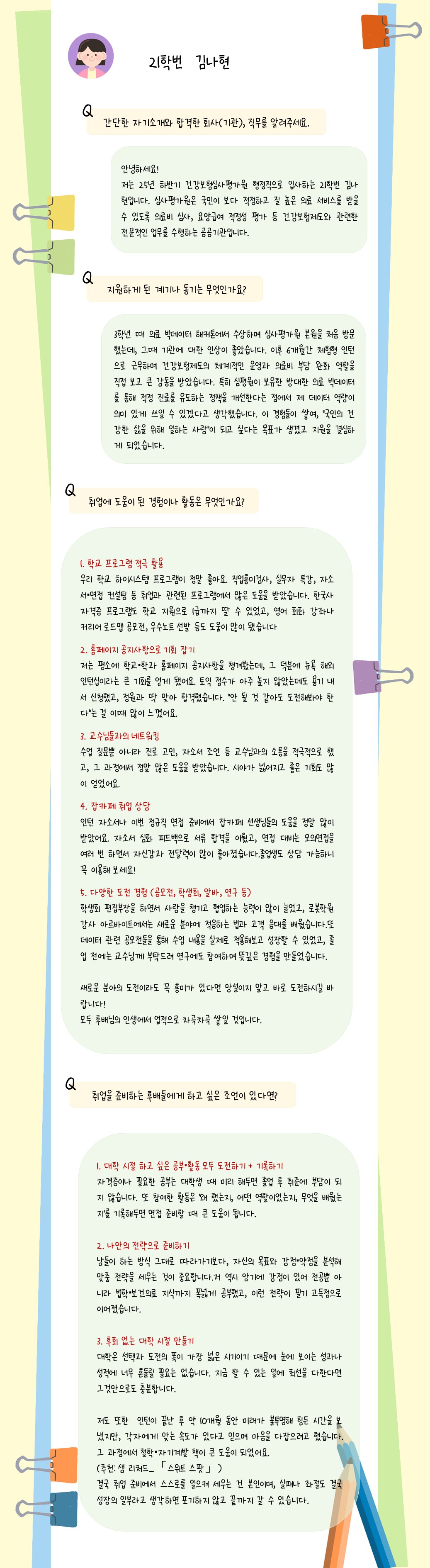 fnctId=bbs,fnctNo=242 [선배들의 취업 스토리] 21학번 김나현 졸업생 (건강보험심사평가원) 작성일 2025.12.11 작성자 데이터사이언스학과 조회수 417 “취업 고민하는 후배들을 위한 선배들의 진짜 조언” “취업 준비? 선배들의 경험담에서 답을 찾아보세요 :)” 첨부파일 첨부파일이(가) 없습니다.